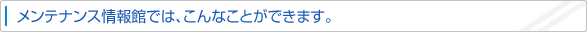 メンテナンス情報館は、インタ-ネットを通してお客様に『くるまに関する様々な情報』をご提供する当社の新しい車両情報サ-ビスです。 ご利用には、当社が発行する【ユ-ザID・パスワ-ド】が必要となります。